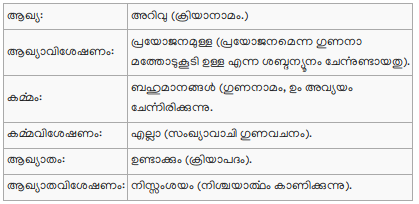 112. ആഖ്യ എല്ലായ്പോഴും പ്രഥമവിഭക്തിയിൽ ആയിരിക്കും. ആർ, ഏതു എന്ന പദങ്ങളെ ഒരു വാക്യത്തിലെ ക്രിയയോടു ചേൎത്തുണ്ടാക്കിയ ചോദ്യത്തിന്നുത്തരമായി വരുന്നതു ആഖ്യ. രാമൻ വന്നു ഇതിൽ ആർ? വന്നുഎന്ന ചോദ്യത്തിന്നുത്തരം രാമൻ എന്നാകയാൽ രാമൻ ആഖ്യയാകുന്നു. എന്തു എന്നതിനെ വാക്യത്തിലെ ക്രിയയോടു ചേൎത്തുണ്ടാകുന്ന ചോദ്യത്തിന്നുത്തരമായ്വരുന്ന ക്രിയ ആഖ്യാതം. രാമൻ വന്നു. രാമൻ എന്തു ചെയ്തു? വന്നു എന്നുത്തരം. അതിനാൽ വന്നു എന്നതു ആഖ്യാതം. വാക്യത്തിലെ ക്രിയയെ ആരെ, എന്തിനെ എന്ന പദങ്ങളോടു ചേൎത്തു വാക്യം ഉണ്ടാക്കി അതിന്നുത്തരമായി കിട്ടുന്നതു തന്നെ കൎമ്മം. രാമൻ കുട്ടിയെ അടിച്ചു എന്നേടത്തു രാമൻ ആരെ അടിച്ചു എന്ന ചോദ്യത്തിന്നുത്തരമായി കുട്ടിയെ എന്നു പറഞ്ഞാൽ കുട്ടിയെ എന്നതു കൎമ്മം. കൎമ്മം ദ്വിതീയവിഭക്തിയിൽ ഇരിക്കും,