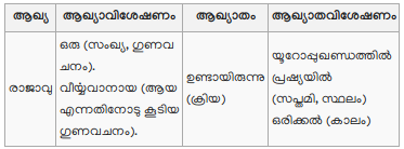 113. ആഖ്യയും കൎമ്മവും എല്ലായ്പോഴും നാമം ആയിരിക്കും ആഖ്യാതം ക്രിയയോ നാമമോ ആയിരിക്കും. നാമം ആഖ്യാതമാകുന്നു എങ്കിൽ അതിനോടു കൂടി സംബന്ധക്രിയ ചേരും.