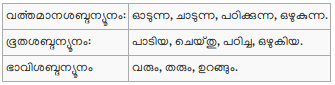 90. വൎത്തമാനത്തിന്റെ രൂപത്തോടു അ പ്രത്യയം ചേൎത്താൽ വൎത്തമാനശബ്ദന്യൂനവും ഭൂത്രരൂപത്തോടു അപ്രത്യയം ചേൎത്താൽ ഭൂതശബ്ദന്യൂനവും ഉണ്ടാകും. ഭാവി ശബ്ദന്യൂനത്തിന്നു പ്രത്യയം ഇല്ല. ഭാവിരൂപം തന്നേ മതി.
