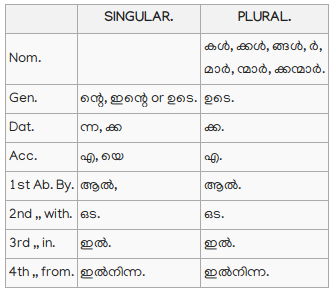 55. Nouns whose nominative end in ം, drop that character; and add ത്ത, to which the above signs, beginning with ഇന്റെ, are added for the different cases. To most other nouns the signs are added to the nominative in its full shape.