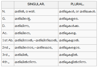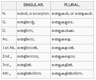 In the plural these nouns are declined like തെൾ; thus, ആറുകൾ,—വീടുകൾ.