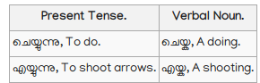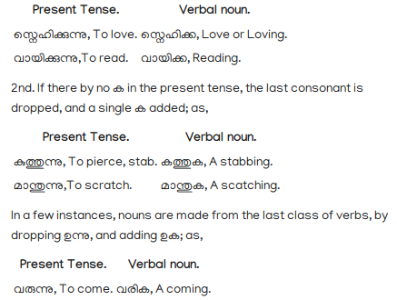 In a few instances, nouns are made from the last class of verbs, by dropping ഉന്നു, and adding ഉക; as,
