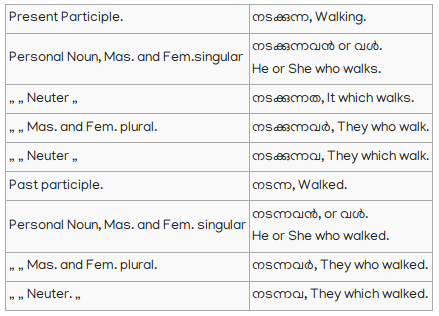 RULE XII. Personal nouns are formed from the participles by adding the pronouns അവൻ He, അവൾ She, അത It; and their plurals: thus,