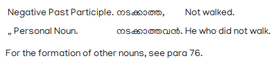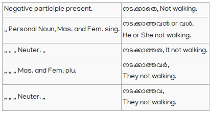 Negatives, of this class of words are formed by adding the pronouns as above to the negative participle, from which എ has been removed and its last letter ത doubled; as,