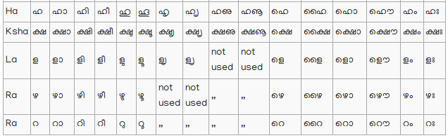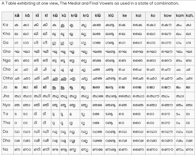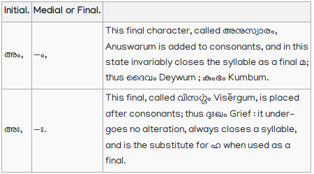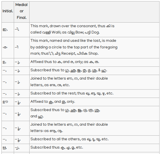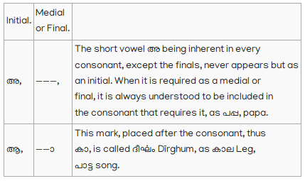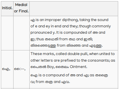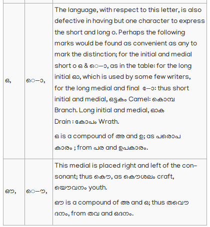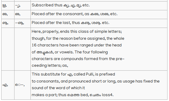 13. Vowels, not initial, when joined to consonants, assume a different form, but retain their own sound, and are pronounced after the consonants to which they are attached: thus; In an ancient Malayalim Alphabet, now nearly obsolete, which appears to have been derived from an old Tamil Alphabet, of peculiar character, and used for writing title deeds and grants of land, there are two characters to distinguish the short and long എ; and it would tend to make this language more definite, and be of great assistance to lear ers; if something to answer the same purpose could be introduced into the present Alphabet. To adopt the old Malayalim character would require a change in the consonant to which the medial character must be annexed; but as this would not be desirable, perhaps the introduction of the following character േ, used as the medial of long എ in Tamil would be the least objectionable; thus മെത്ത, ചേതം, For this initial, I propose this character ഏ: thus എണ്ണ Oil; ഏഷണി Malice, Backbiting.
