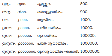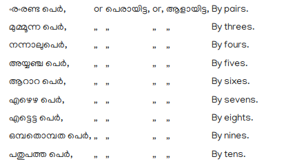 136. The Cardinal numbers with the exception of ഒന്ന one, the use of which has already been pointed out, are used as nouns, or adjectives; when as the latter, they are placed before their substantives and governed by the same laws as other adjectives. As nouns, they are used absolutely, or placed after nouns and regularly declined; as,