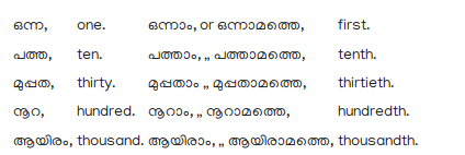 134. Ordinal numbers are formed by the addition of ആം or ആമത്തെ to the Cardinal numbers; thus