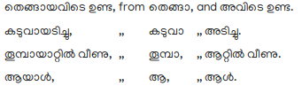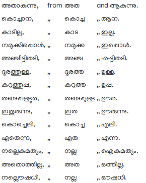 First. Of words ending in short അ. When a word ending with the open vowel sound of അ is followed by another word that begins with അ short; the first letter of the word to be affixed is dropped, and in this state the words coalesce; the last letter of the first word retaining its vowel sound; asഇരിക്കെണ്ടുന്നതാകുന്നു from ഇരിക്കെണ്ടുന്ന and അതാകുന്നു. കൊതമ്പപ്പം from കൊതമ്പ, and അപ്പം.
