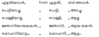 Eleventhly. In cases where words, beginning with the letter എ, are affixed to others ending in a vowel, the എ is changed into its medial and placed before the last consonant of the word prefixed, from which its own vowel has been previously removed; as,