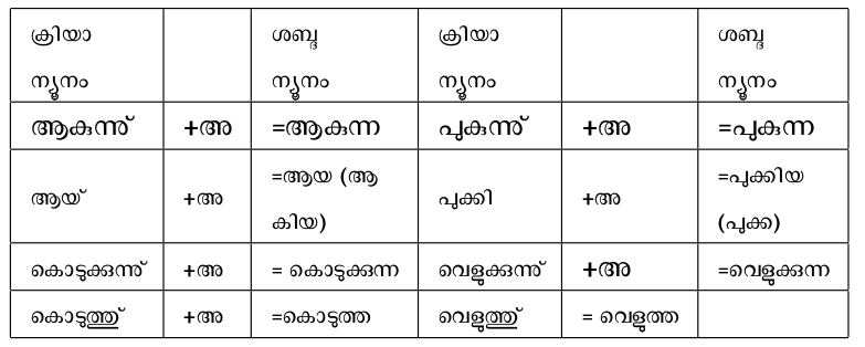 വൎത്തമാനഭൂതകാലങ്ങൾക്കു ശബ്ദന്യൂനം ഉണ്ടാകുന്നതു ക്രിയാന്യൂനത്തോടു അ എന്ന പ്രത്യയം ചേരുകയാൽ തന്നെ.