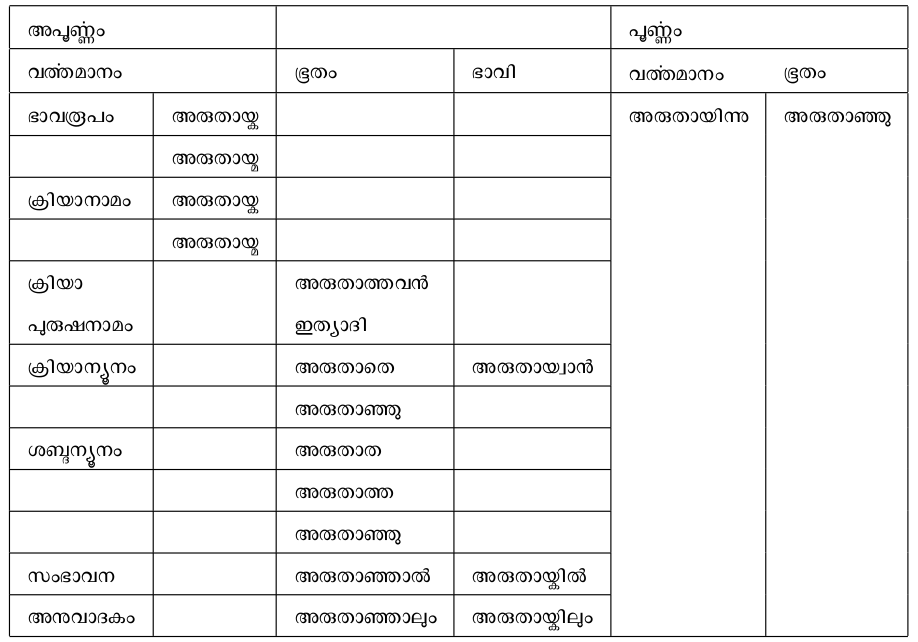 iii.) അരുതു എന്നുള്ളതു അരു ധാതുവിന്റെ നപുംസകം എങ്കിലും നിഷേധക്രിയയുടെ മിക്കരൂപങ്ങളിലും പ്രയോഗിച്ചു വരുന്നു.