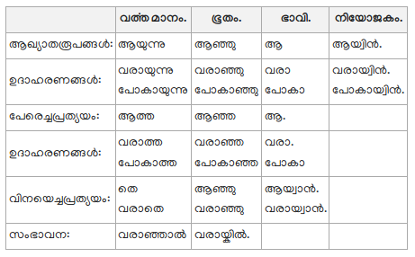 124. ആ എന്ന ധാതുവിന്റെ രൂപങ്ങളെ ക്രിയാധാതുക്കളോടു ചേൎത്തു അവയുടെ നിഷേധരൂപങ്ങളെ ഉണ്ടാക്കും. ആ രൂപങ്ങളെ താഴേ ചേൎക്കുന്നു.